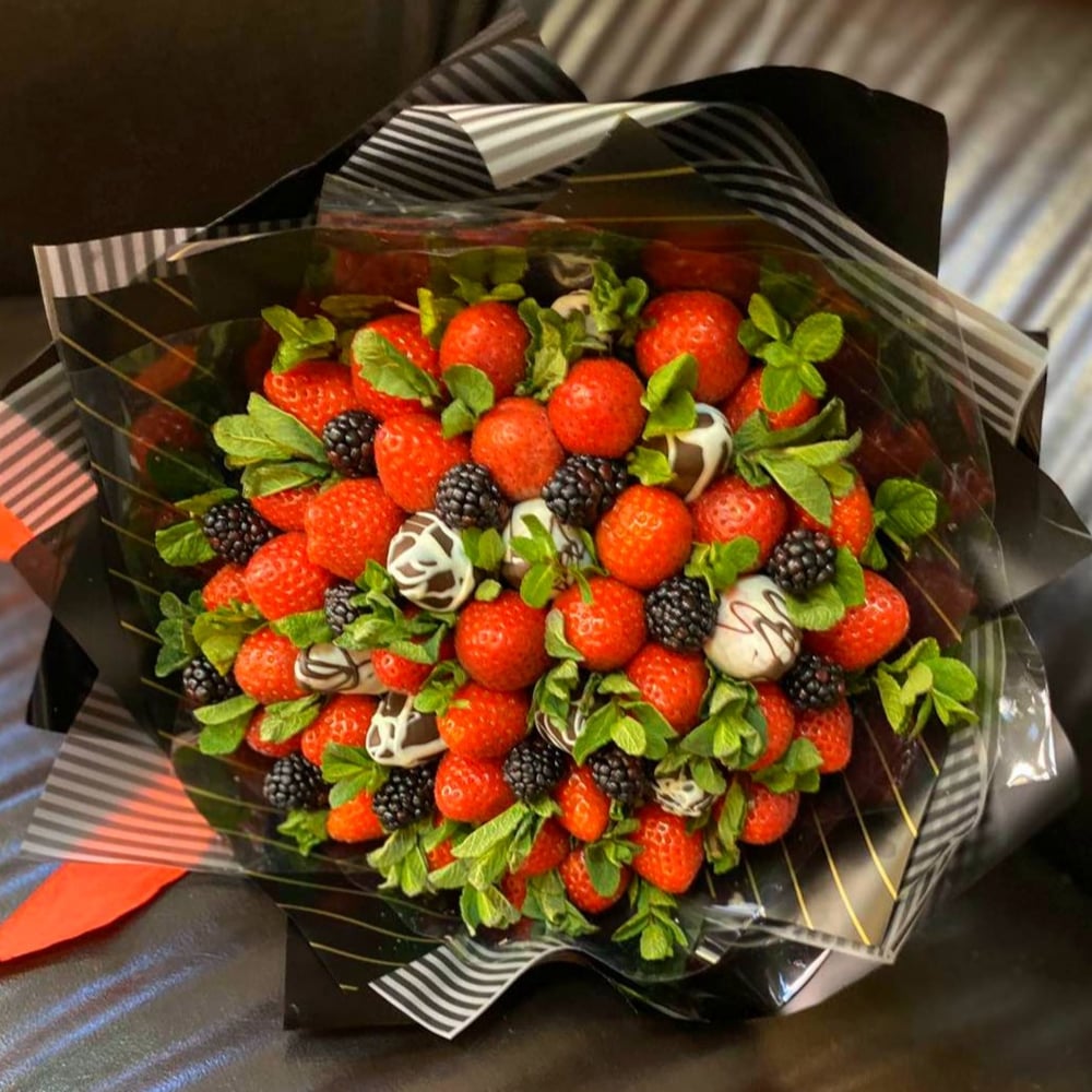 Клубника, ежевика, мята и клубника в Бельгийском шоколаде! Упаковывается в прозрачную пленку с бантом.