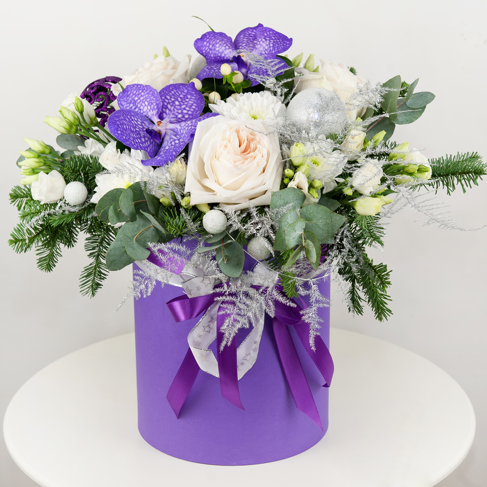 Этот букет - как метель в зимнюю ночь, сочетая орхидею, лизиантус, розу и хризантему кустовую. Эвкалипт цинерия и аспарагус умбелатус добавляют свежести, а шляпная коробка и новогодний декор придают композиции завершенность и праздничный вид.