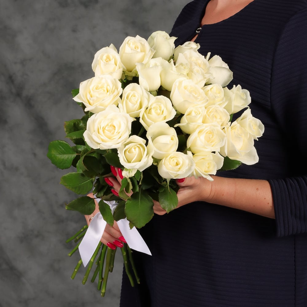 Букет из 25 белых роз. Сорт: Аваланж. Упаковка: Лента.
