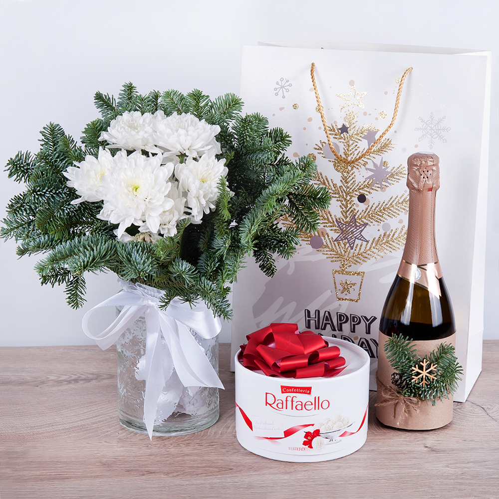 Снежный карнавал — это не только чудесные цветы, но и прекрасное дополнение к зимнему празднику: безалкогольное шампанское и сладкий "Торт Raffaello". Стильно упакованный букет из хризантем в сочетании с елью и эустомой станет незаменимым подарком.