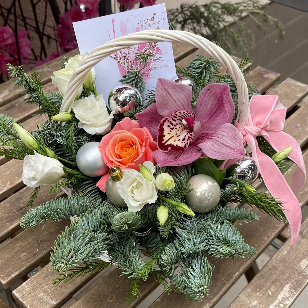 Корзина с цветами «Снежный ком» из эустом и роз