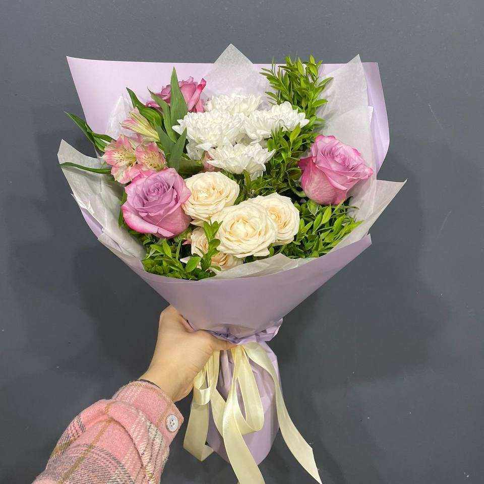 Букет «Снежный лавандовый» из роз и хризантем