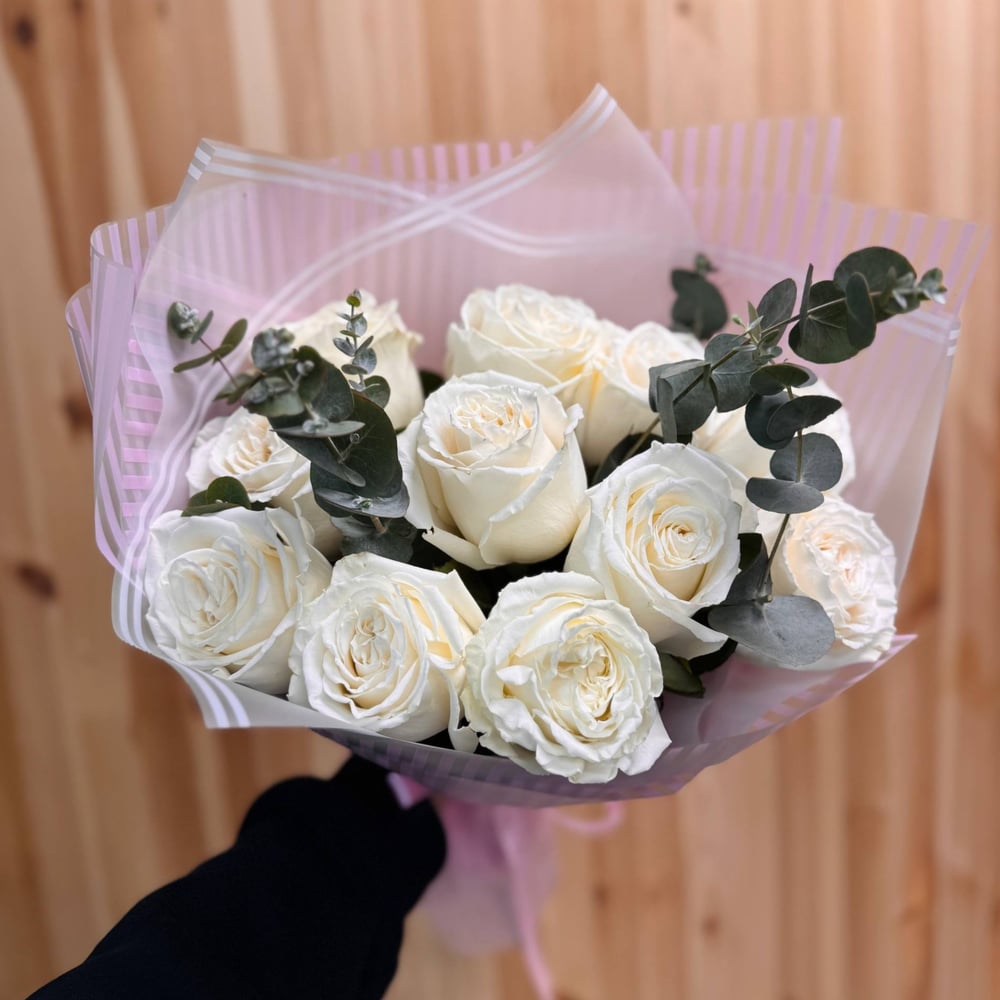 Очаровательные пионовидные розы в сочетании с элегантным эвкалиптом, это роскошный подарок, способный покорить любое сердце! Эмоции в Вашем букете доставит наш пунктуальный и вежливый курьер.