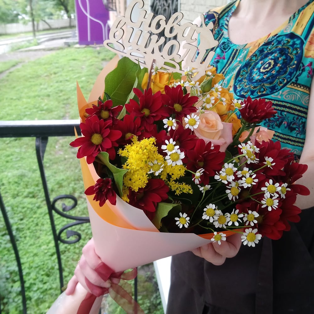 Букет «Снова в школу» из роз и хризантем