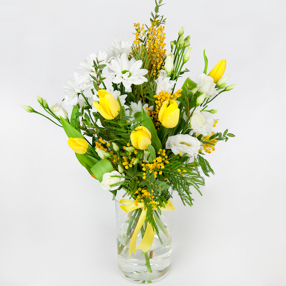 Букет из солнечных тюльпанов, ароматных веток мимозы, белых хризантем и лизиантусов заставит ее лицо и комнату залиться красивым солнцем. Замечательный подарок для особенного человека.