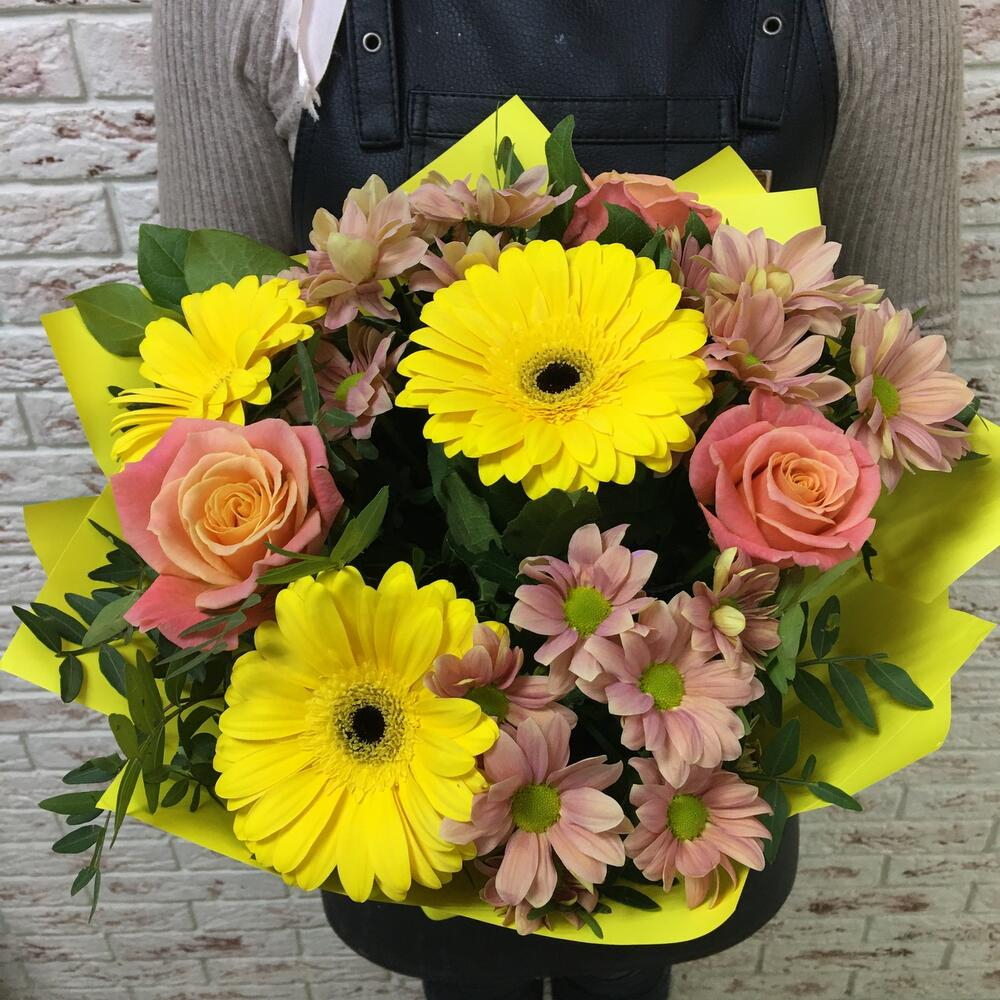 Сочный яркий букет, основным цветком которого является гербера. Нежные хризантемы повторяют форму гербер, что придает сборке гармоничный вид.