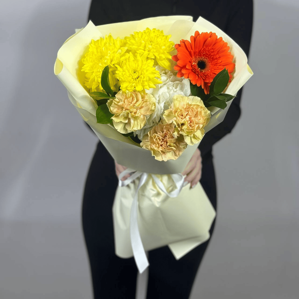 Букет «Солнечный мир» из гвоздик и хризантем