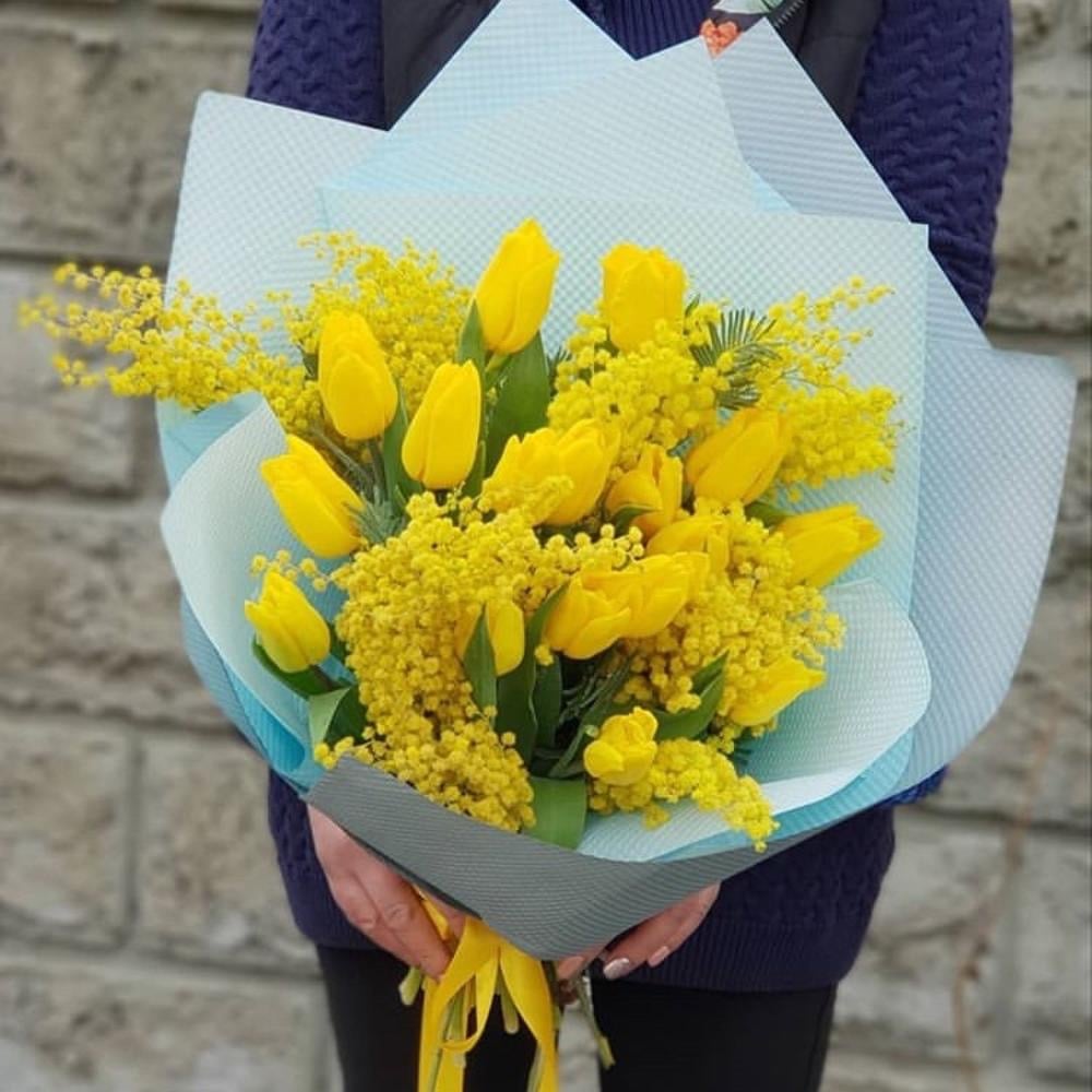 Яркий солнечный жизнерадостный букет весенних цветов. Стойкие тюльпаны сорта Стронг Голд в сочетании с ароматной итальянской мимозой подарят заряд позитива и отличного настроения!