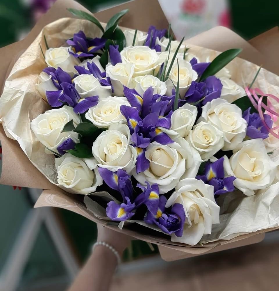 Букет из белых нежных роз с ирисами исполнен нежности, любви и светлого настроения. Он просто просится в руки прекрасной особе – юной, мечтательной и скромной!