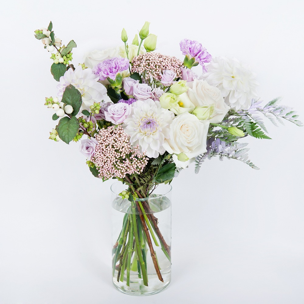 Нежный микс белых кустовых роз, лизиантуса, георгина, гвоздики и зелени в сочетании с папоротником и гиперикумом упакован в современную упаковку и украшен атласной лентой. Букет подарит гармонию и ощущение воздушной легкости в самый важный день.