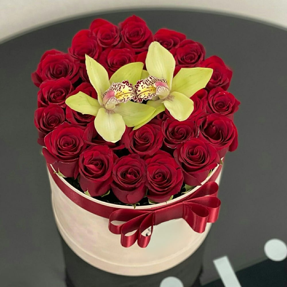 Розы красные эквадор в шляпной коробке, дополненные орхидеями