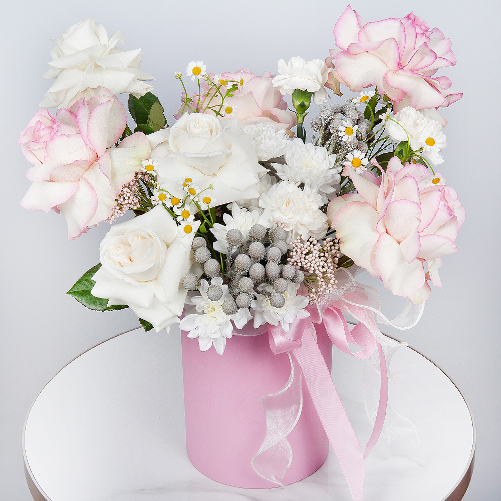Одна из самых ярких звезд среди цветочных композиций. Нежные кустовые хризантемы, элегантные розовые и белые эквадорские розы гармонично сочетаются с гвоздиками, озотамнусом, танацетумом и брунией, эффектно дополняющими композицию. Упакованный в элегантную шляпную коробку с лентой, букет станет великолепным подарком для выражения самых глубоких чувств.
