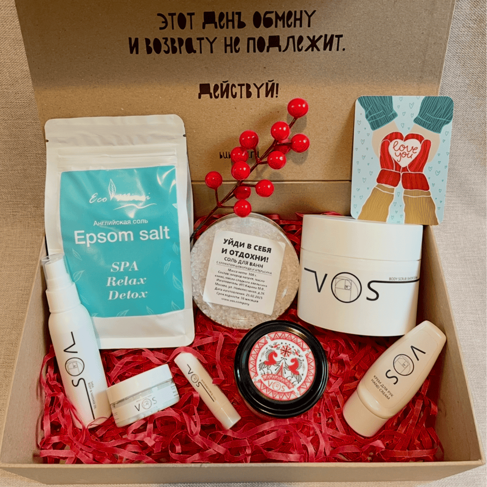«Зимний десерт для кожи» — СПА-набор с ягодными ароматами и органической косметикой. Скраб, масла, ванны и свеча создают ощущение уюта, тепла и маленького праздника для тела и настроения. Идеальный подарок девушке, чтобы порадовать — красиво, вкусно и по-настоящему празднично 🍓 Состав: 1. Скраб для тела Smorodina от органического бренда VOS (200мл) с аппетитным ягодным ароматом, не просто вкусный, но и полезный десерт для кожи. 2. Масло Shea от VOS (50 мл, спрей) обладает завораживающим ароматом ореха ши, тиаре и цветков апельсинового дерева. 3. Крем для рук от VOS (30мл) дарит рукам мягкость и комфорт. 4. Питательная маска для лица (30 мл) от VOS. 5. Бальзам для губ Babushka’s pie от VOS (5мл) с маслом ши, сои и яблочных и грушевых семян бережно ухаживает и увлажняет нежную кожу. 6. Соль для ванны от VOS с ароматом шоколада и апельсина (300г) 7. Английская магниевая соль для ванной EcoMirai (500г) - настоящее сокровище для красоты. 8. Арома свеча из соевого воска Ягода-Малина (100мл). 9. Дизайнерская открытка 10. Крафтовая коробка из плотного картона на магнитном клапане с вдохновляющей надписью, которую захочется сохранить для хранения любимых предметов