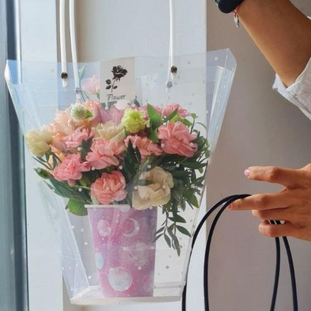 Композиция «Стакан с цветами» из гвоздик и роз