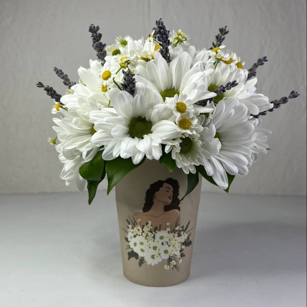 Цветочная композиция из хризантемы, ромашки и лаванды, повторяющая состав букета девушки с картинки изображенной на декоративном стаканчике, в котором собрана композиция.