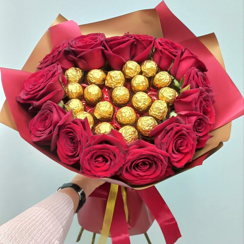 Букет Красная роза с конфетами в форме сердца