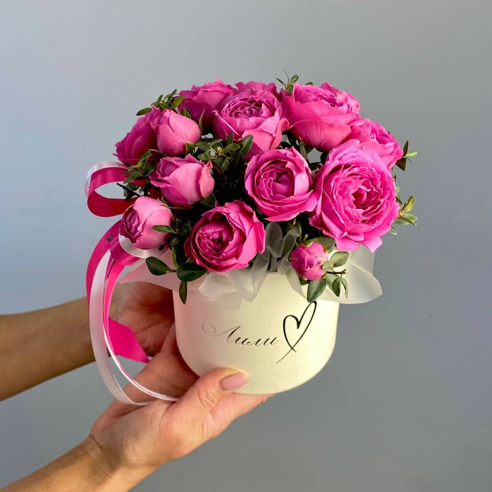 Композиция из кустовых,пионовидных роз в шляпной коробке