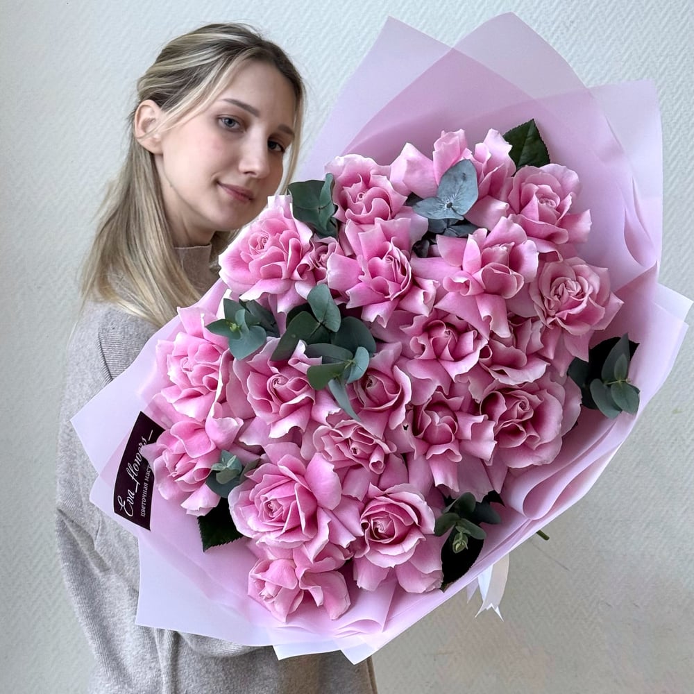 Этот изысканный букет состоит из красивых роз, которые символизируют нежные чувства и уважение, а также свежего эвкалипта, придающего ему особый аромат. Букет упакован в оригинальную авторскую упаковку, украшенную атласной лентой, что делает его еще более прекрасным и элегантным подарком.