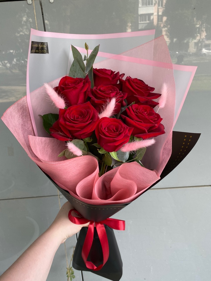 Букет из 7 ароматных красных роз в авторской упаковке.
