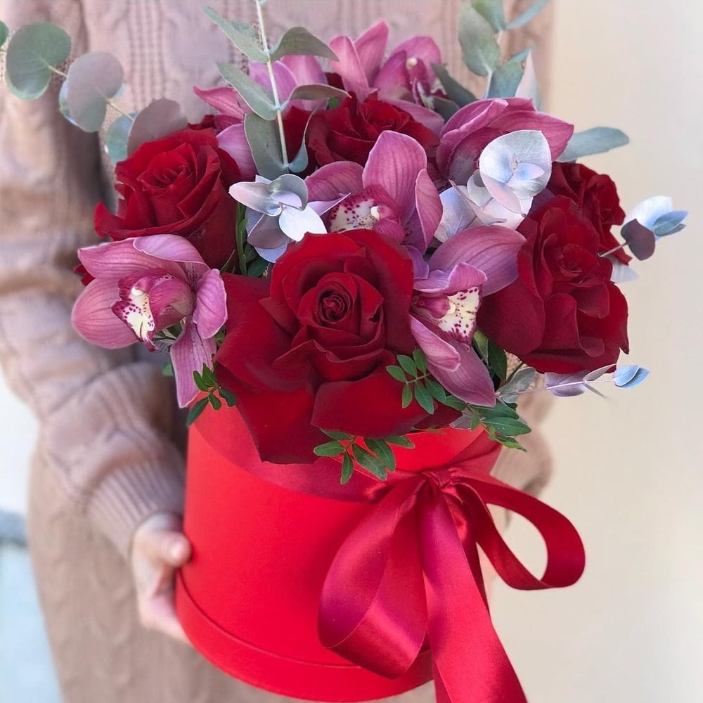 Шляпная коробка с цветами «Страсть» из роз и орхидей