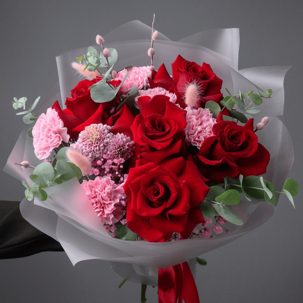 Страсть и нежность — букет с красными розами Эффектный букет с бархатными красными розами и нежными розовыми акцентами — гармоничное сочетание страсти и утончённой нежности. Глубокий алый цвет роз…
