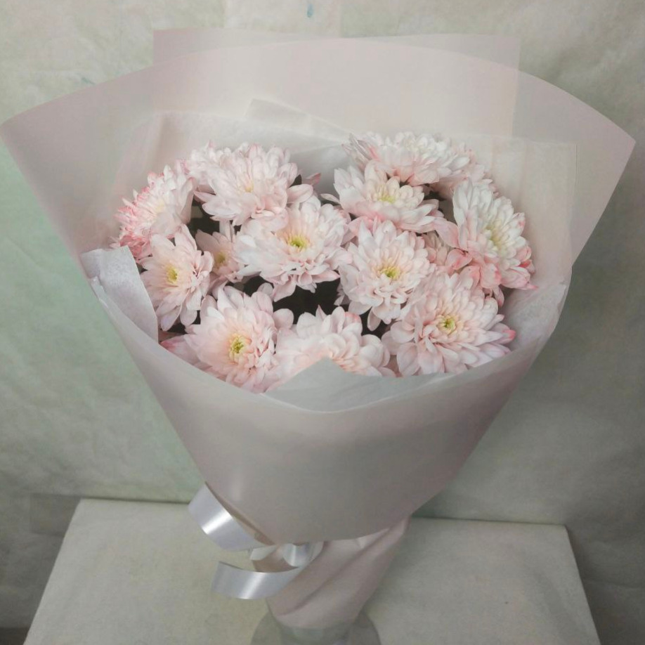 Букет из стойких хризантем в нежных тонах подарит хорошее настроение.