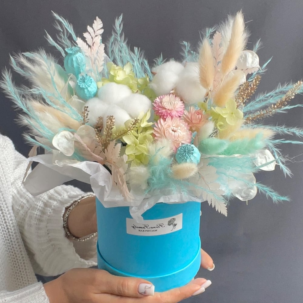 Сухоцветы и стабилизированные цветы в шляпной коробке.