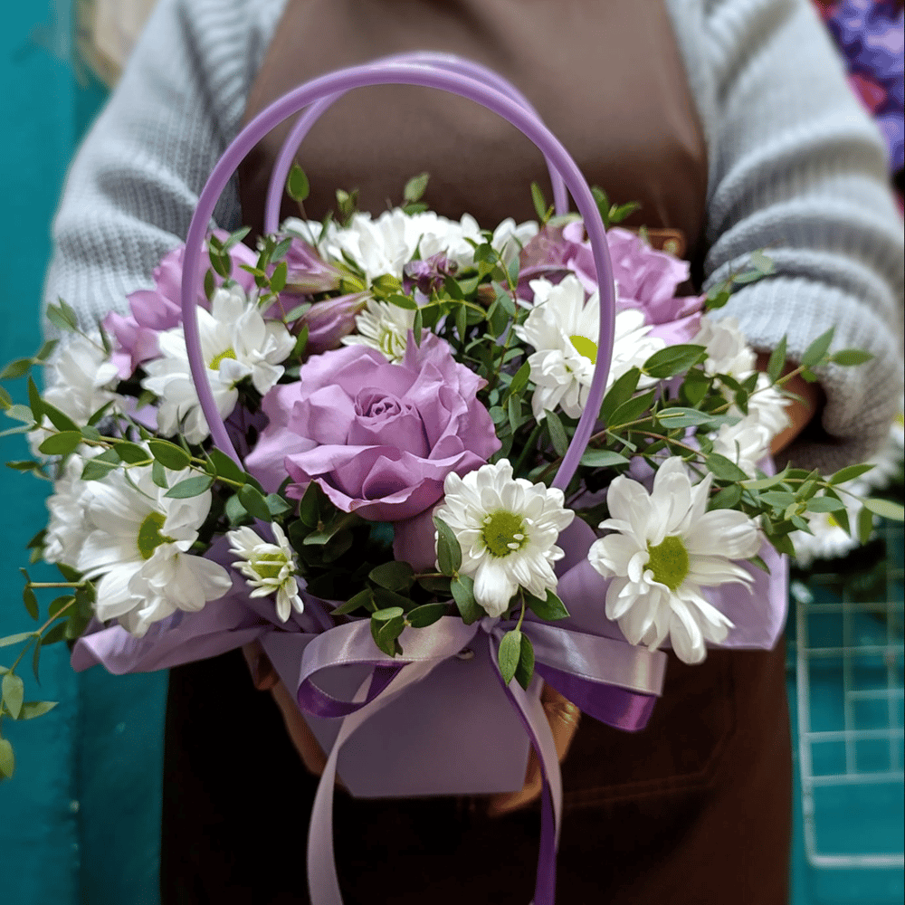Коробка с цветами «Сиреневый бриз» из роз и хризантем
