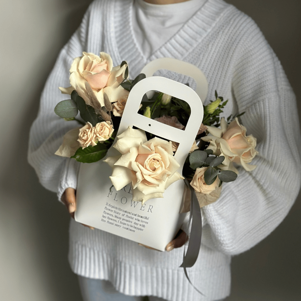Коробка с цветами «Сумочка Джейн» из роз и эустом