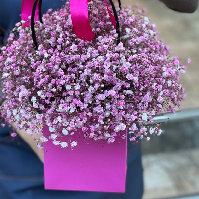 Нежный и воздушный букет, состоящий из трех веточек гипсофилы, упакованный в стильную сумочку. Цветы уютно расположены в оазисе, что сохраняет их свежесть и красоту. Упаковка дополнена атласной лентой, создавая ощущение праздника и радости. Этот букет станет прекрасным подарком для любого повода.