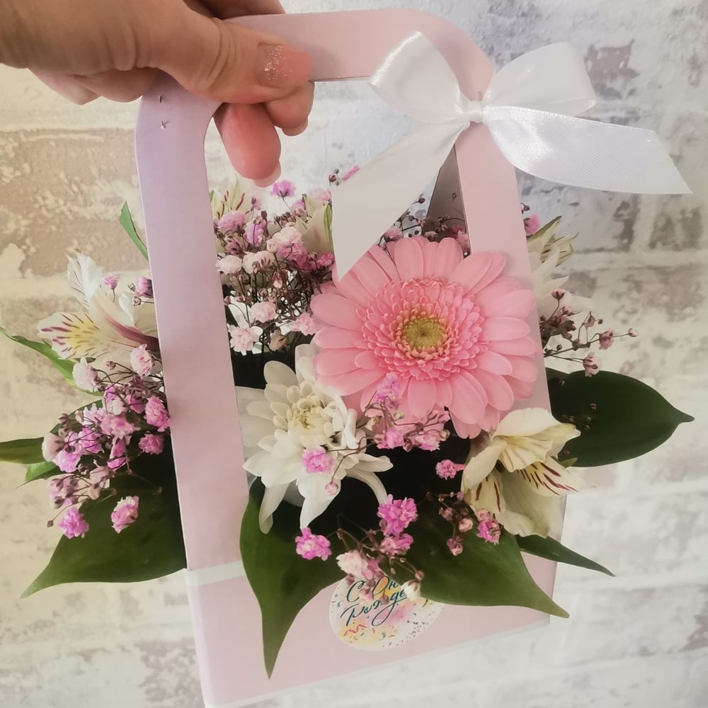 Композиция «Сумочка малышка» из хризантем и альстромерий