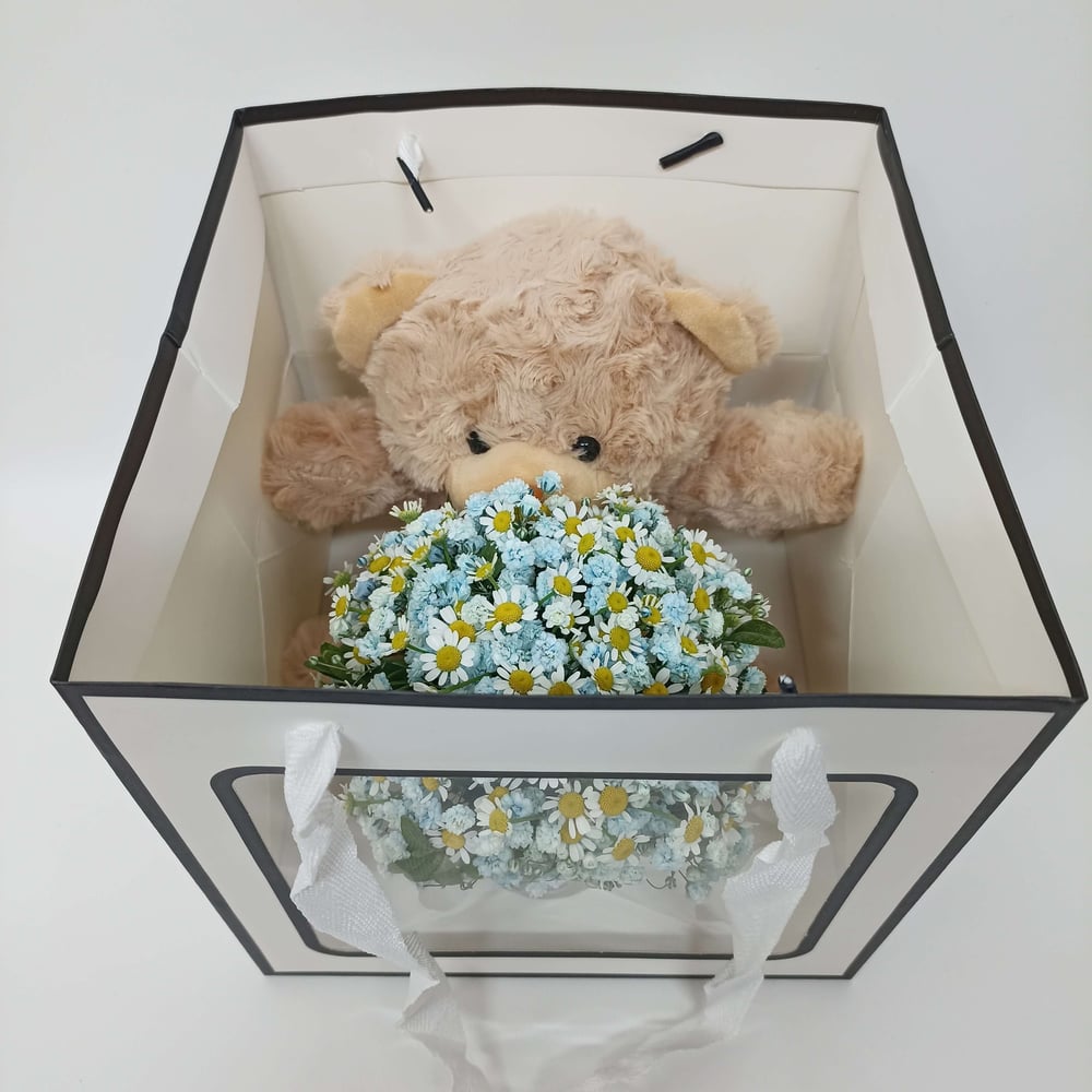 Сумочка с прозрачным окошком, через которое можно насладиться видом букетика свежей ромашки и воздушного облачка гипсофилы, бережно удерживаемого милым плюшевым мишкой.