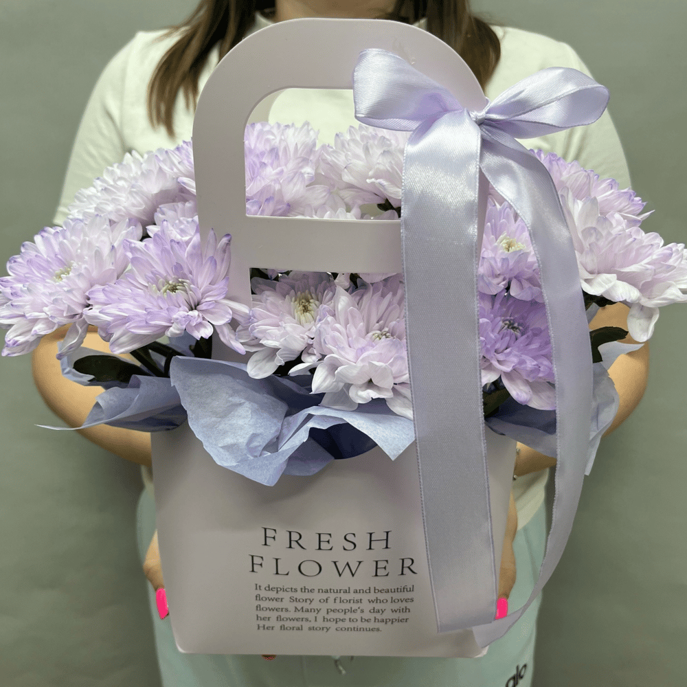 Коробка с цветами «Сумочка с фиолетовой хризантемой»