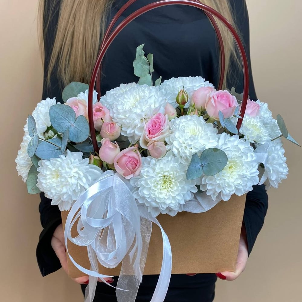 Коробка с цветами «Сумочка с хризантемой и кустовыми розами»