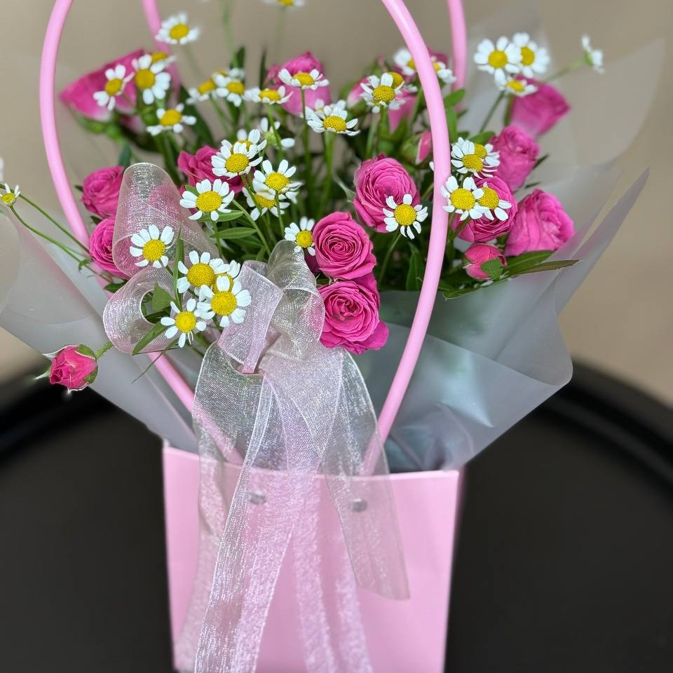 Коробка с цветами «Сумочка с кустовой розой и ромашками»