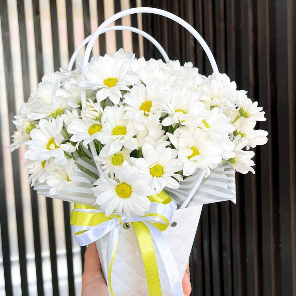 Шляпная коробка с цветами «Сумочка с ромашками» из хризантем