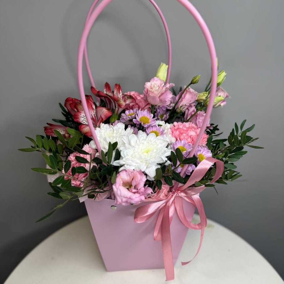 Коробка с цветами «Сумочка с сантини и хризантемой» из альстромерий