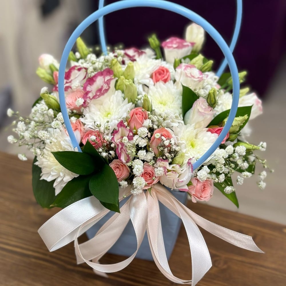 Коробка с цветами «Сумочка с цветами» из эустом и роз
