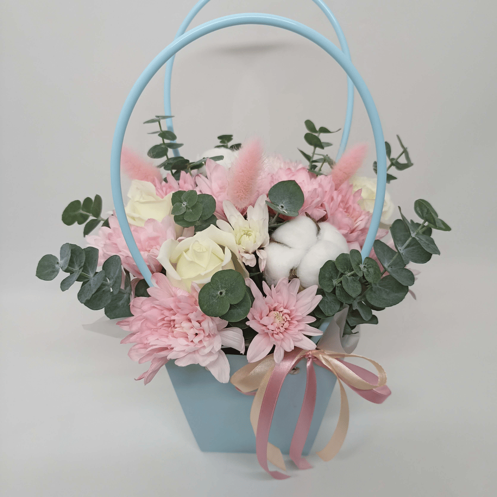 Коробка с цветами «Сумочка с цветами Ангел» из хризантем