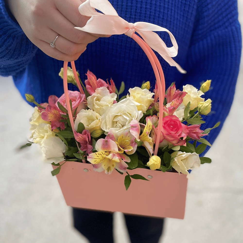 Коробка с цветами «Сумочка с цветами для нее» из альстромерий и эустом