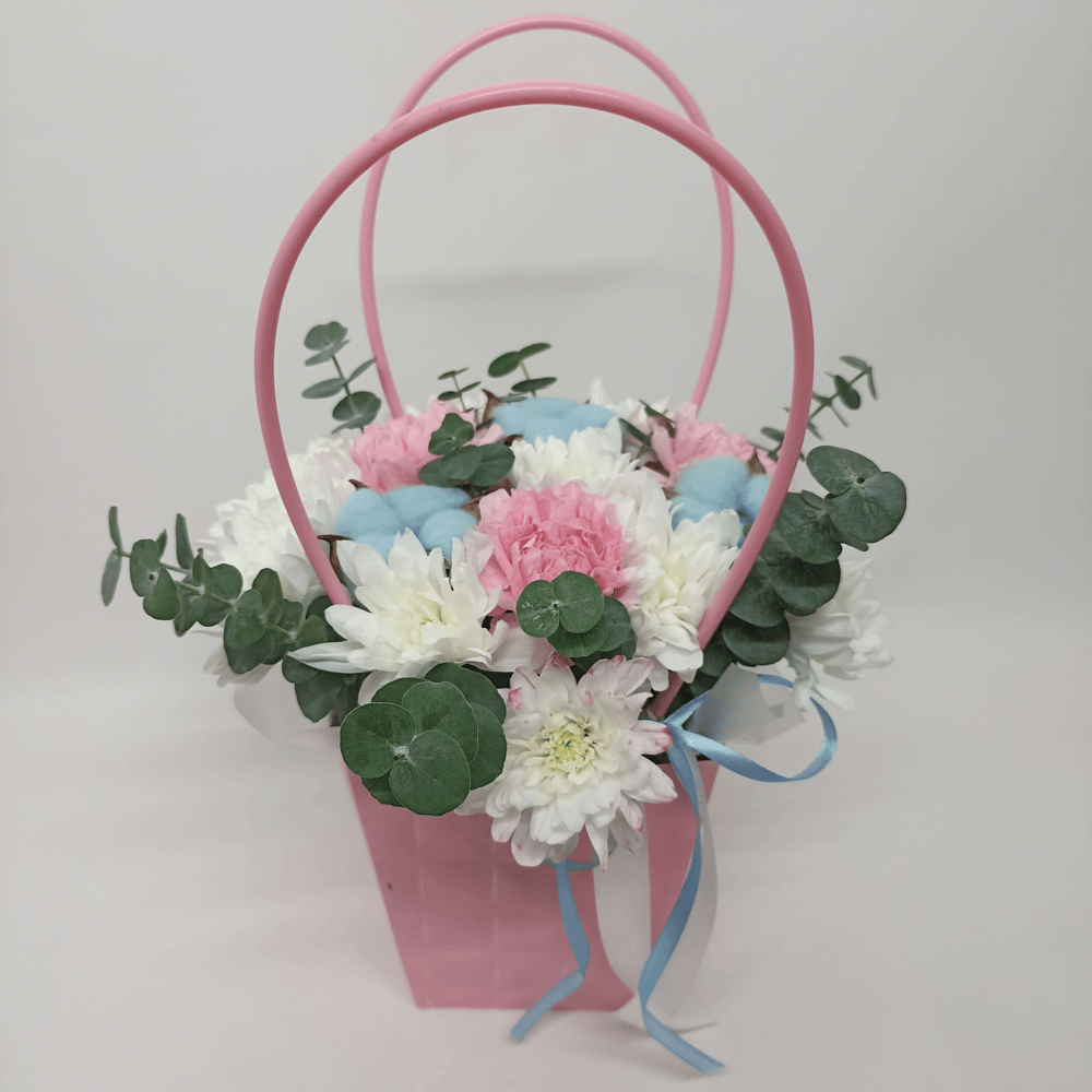 Коробка с цветами «Сумочка с цветами Нежность» из хризантем