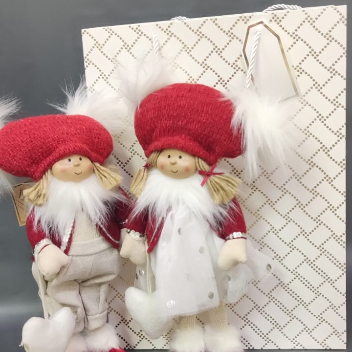 Красивые новогодние сувениры -игрушки мальчик и девочка в красном. Принесут атмосферу нового года и улыбки на лицах! Легкий румянец на сечках игрушек, говорит о зимнем времени чудес! В комплекте с подарочным пакетом светлого цвета размером 31*42см