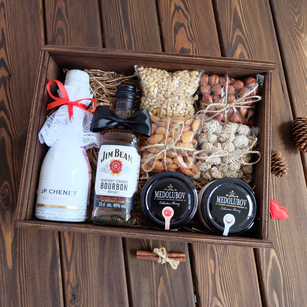 В наборе: 📌Деревянный бокс 29*22*9 см 📌Виски Jim Beam 200 мл 📌Игристое белое полусладкое 200 мл 📌Мёд-суфле 100 гр - 2 шт (вкусы разные) 📌Фундук, миндаль 📌Ядро кедрового ореха 📌Арахис в…