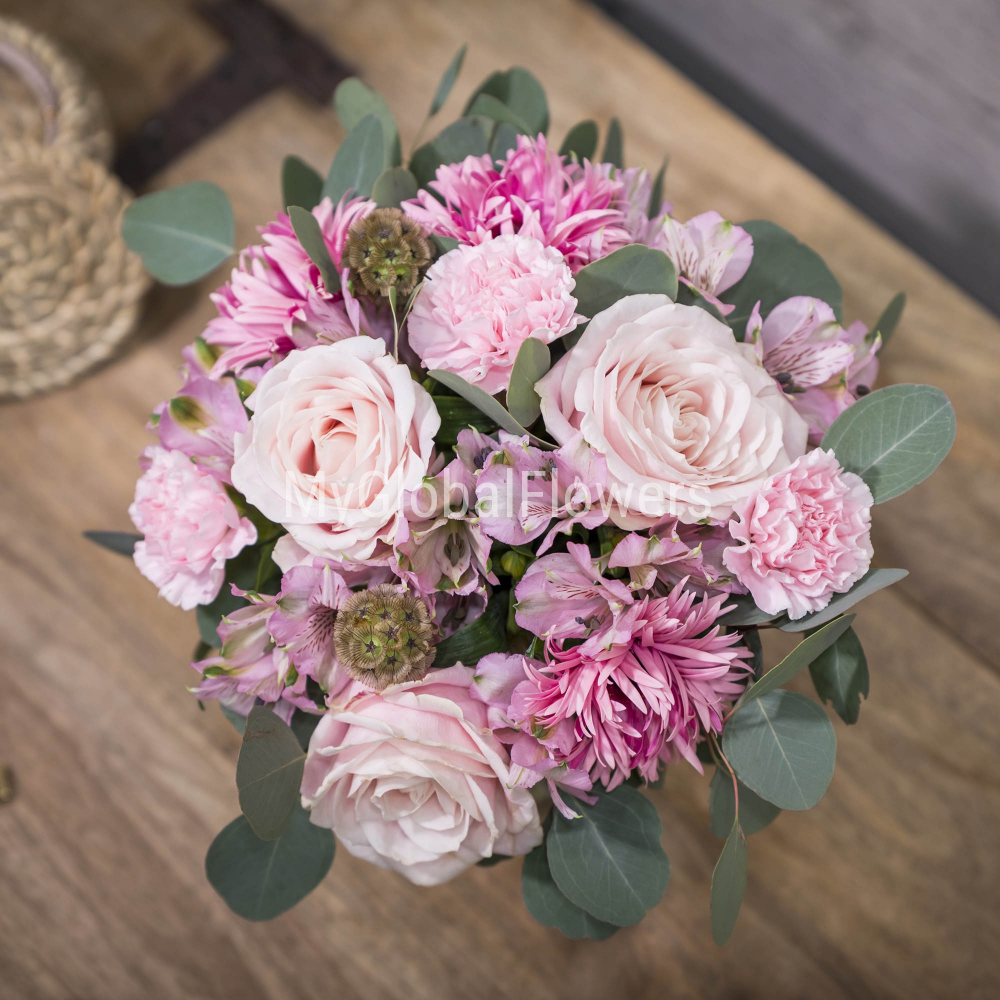 Нежный, утонченный и романтичный — идеальный выбор для самой трогательной церемонии. Пастельные розы, георгины и альстромерии в сочетании с эвкалиптом образуют изысканную композицию в современной упаковке, подчеркивающую естественную красоту невесты.