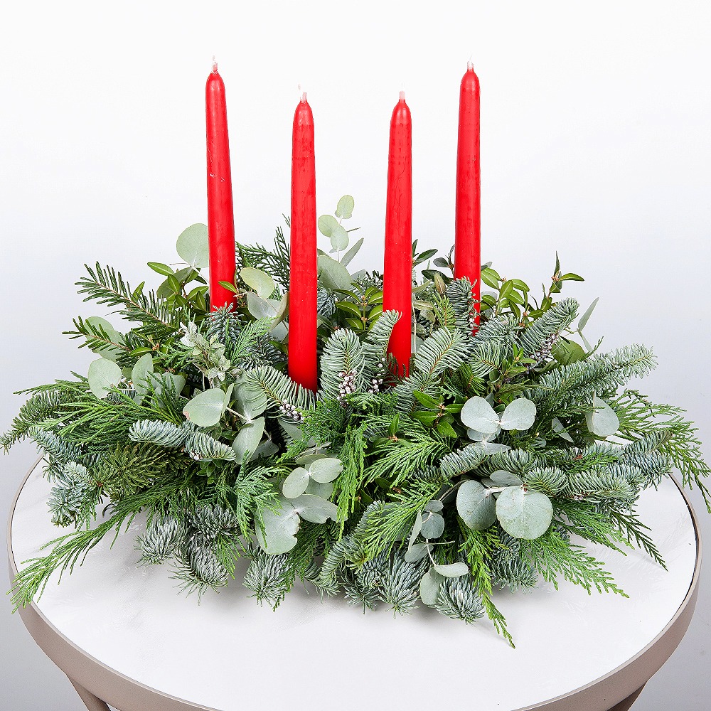 Погрузитесь в атмосферу уютной зимней ночи с этой композицией из эвкалипта, фисташки, ели нобилис и свежей туи. Свечи и элегантное оформление превращают этот композицию в идеальное дополнение к новогоднему настроению и празднику.