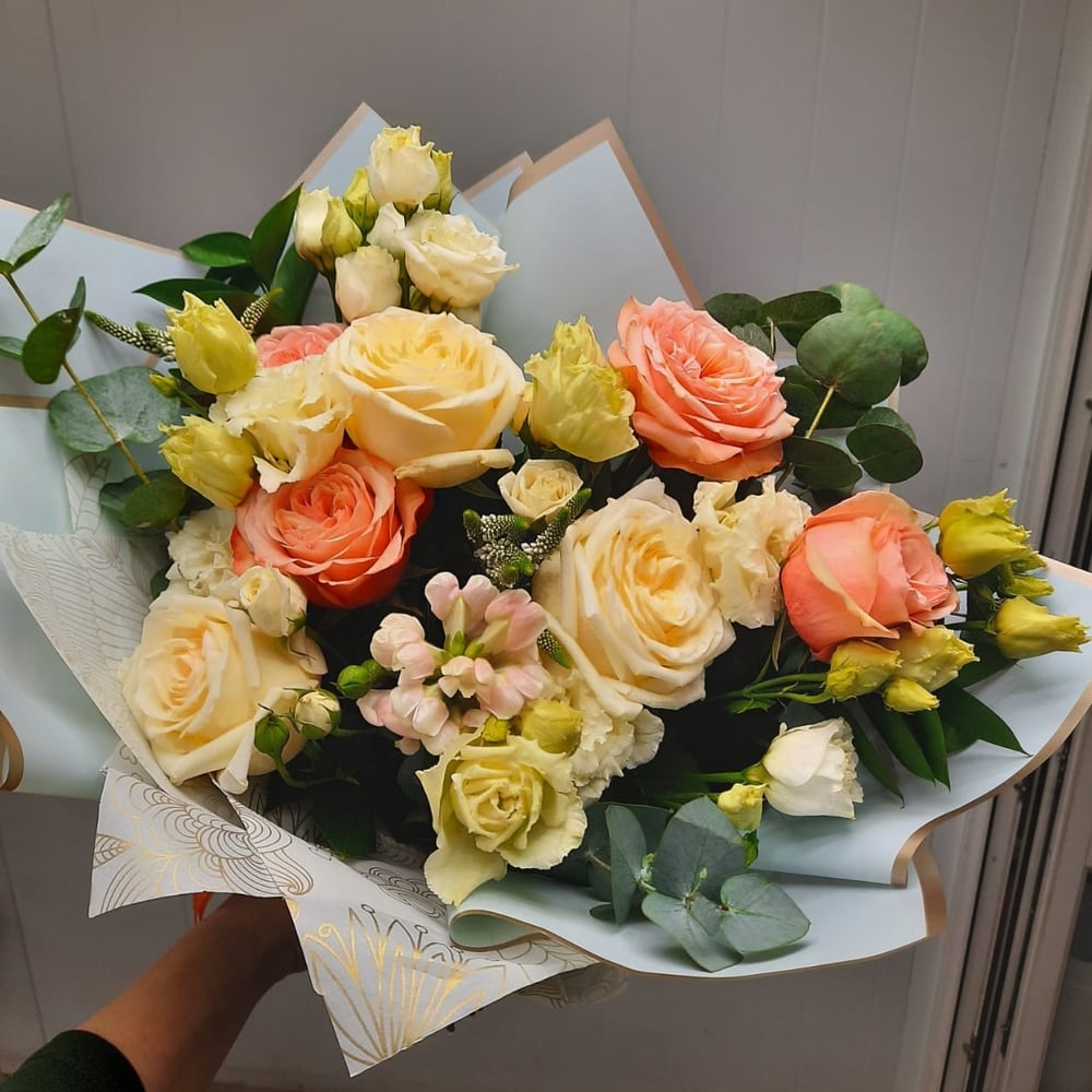 Само воплощение трепетных чувств, легкости и нежности. Букет воплотил в себе теплоту и скромность персиковой розы, чистоту и невинность кремовой розы и чувственность лизиантуса.