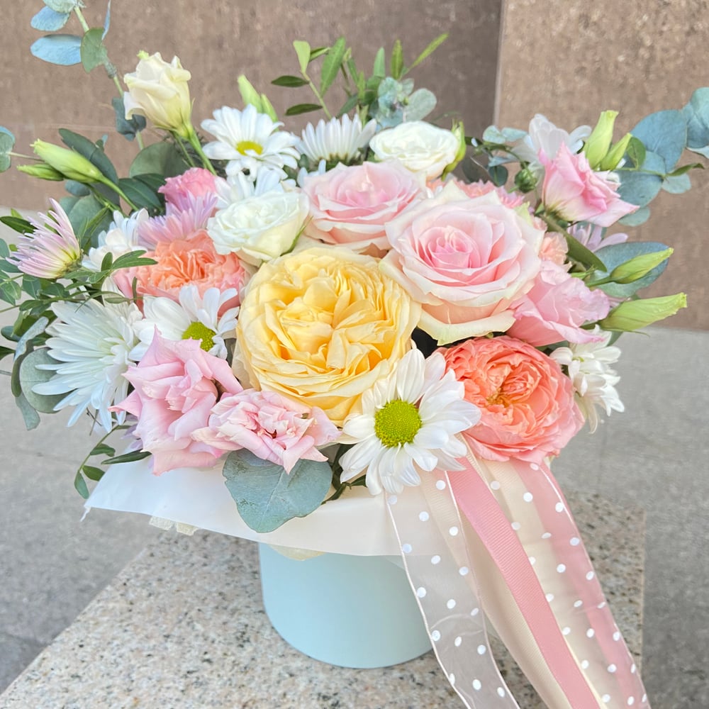 Шляпная коробка с цветами «Светлый день» из роз и хризантем