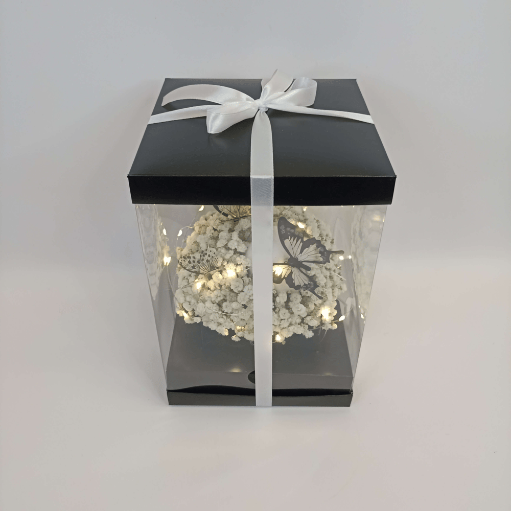 Коробка с цветами «Светящаяся композиция Black and White» из гипсофил