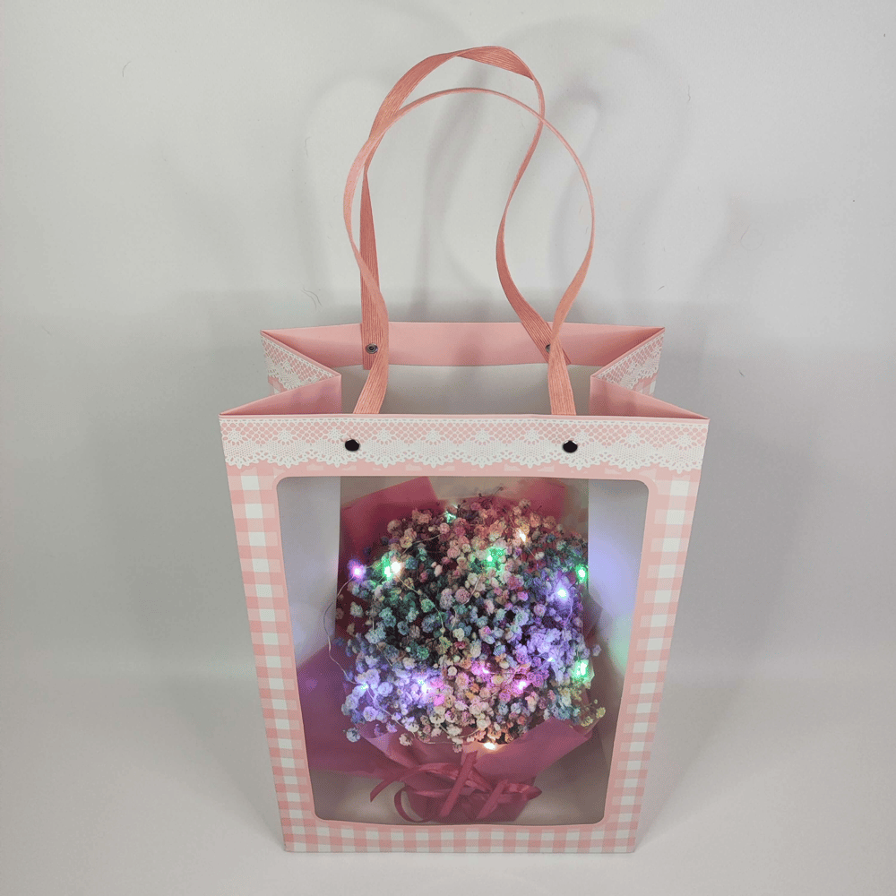 Букетик радужной гипсофилы в прозрачной сумочке украшен светодиодной гирляндой. Эффектный и необычный подарок от флористов ЗЕФИРкО способный произвести впечатление и ни кого не оставить равнодушным.