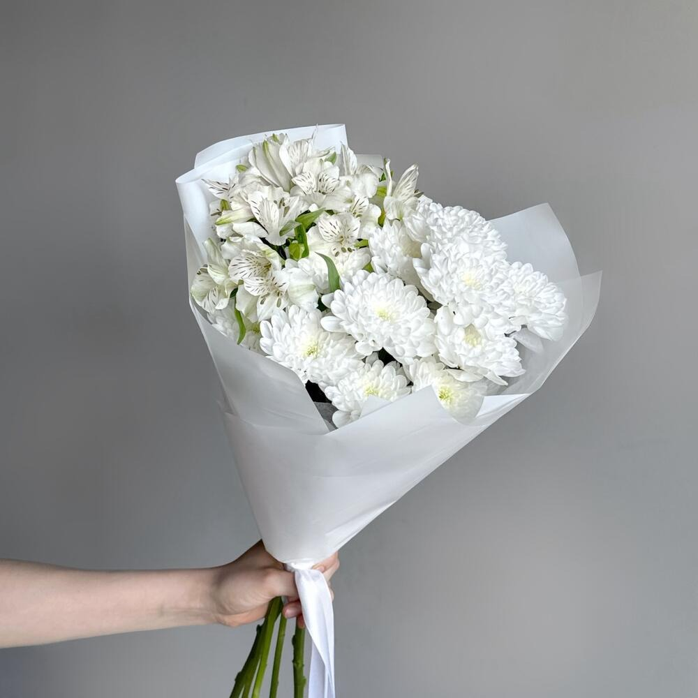Букет «Свежесть» от Mr. Пион Изящная композиция из 3 белоснежных альстромерий и 2 кустовых хризантем «Алтай» — это воплощение нежности и утончённого вкуса. Лаконичный букет смотрится свежо и элега...